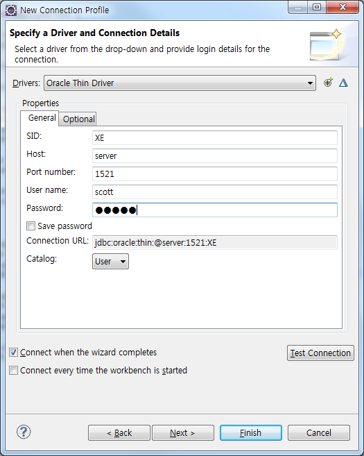 - Properties/General 탭에서 데이터베이스 접속 정보를 입력하고, "Test Connection"을 한다.